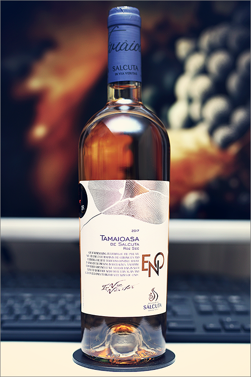 Tonight we are going to review another quite special rosé wine – Eno Tamaioasa de Salcuta 2017 by Salcuta. Freshly released on the local market, this wine is part of the Eno line and is a blend made of two white grape varieties: pinot gris and muscat. The wine’s rosé color comes from the skins of pinot gris grapes, which, despite the fact that it is considered a white grape variety, has pinkish-gray skin color. The other variety, muscat, is responsible for the flavour of the wine, as it provides mesmerizing notes of rose petals and orange blossom. Without further ado, let’s get straight to the tasting!
