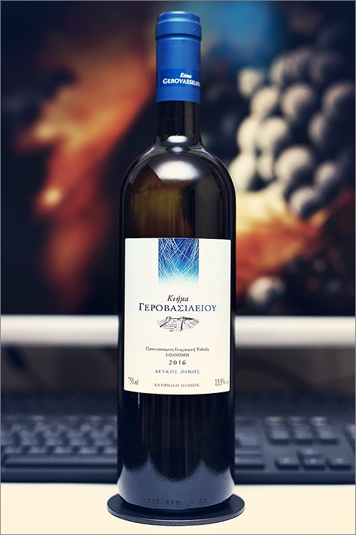 Tonight we are going to review a white wine blend from the Epanomi region of Greece – White 2016 by Ktima Gerovassiliou. The winemaker’s philosophy is to constantly research and experiment with greek grape varieties in order to produce high-quality wines which exhibit all the distinctive characteristics of the Epanomi region’s terroir. This wine is a blend of two greek indigenous grape varieties: malagousia, which forms the wine’s main structure and assyrtiko, which brings acidity and local terrior notes to the final blend. But let’s get rid of the theory and move on to the tasting!