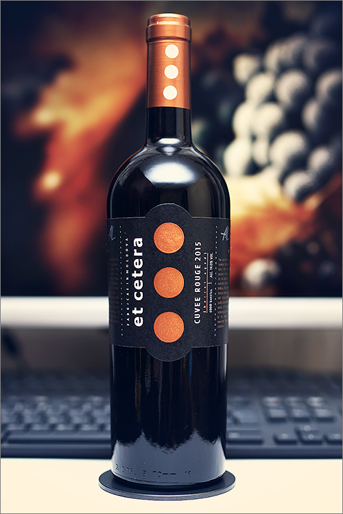 The wine that we are going to review tonight is a rare wine blend from the winemaker’s premium line, also known as the ‘black label’ – Cuvee Rouge 2015 by Et Cetera. The wine has been produced in a limited edition of only 6000 bottles and, as is the norm for this kind of wines, it has been aged for 18 months in new oak barrels. The wine itself is a blend of cabernet sauvignon, which is responsible for the wine’s body, merlot, which adds rounds up all the sharp edges and ass suppliness, and saperavi, responsible for the color depth and leathery notes in the final blend, but enough theory – on to the tasting!