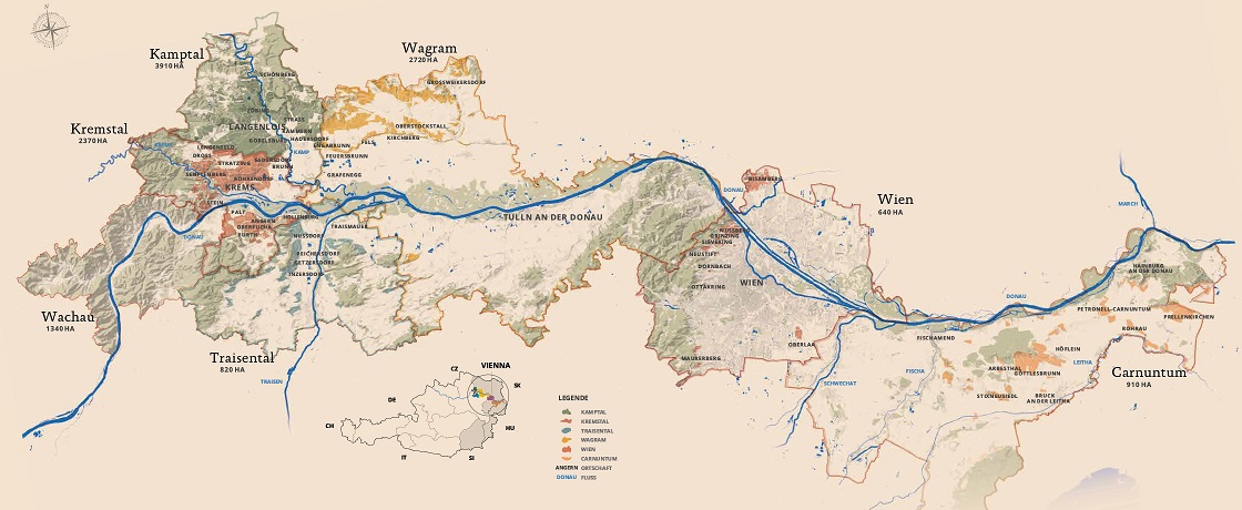 Being Austria’s largest and most diverse wine region, Niederösterreich stretches from the Bohemian Massif in the northwest to the Pannonian Plains near the Hungarian border, encompassing an incredible range of microclimates and soils. The region’s three broad climatic zones (the cooler Weinviertel to the north, the Danube-cooled valleys west of Vienna, and the warmer Pannonian-influenced southeast part) shape its distinctive terroirs. Loess, gravel, limestone, and gneiss dominate the soils, each contributing to the varied expressions of the local grape varieties. The continental climate is moderated by the Danube River and the proximity to the Alps, allowing for a wide diurnal range between warm days and cool nights which helps preserve acidity and aromatic complexity in the grape berries. Niederösterreich is best known for its laser-sharp Grüner Veltliner and bone-dry Riesling, which showcase purity, minerality, and vivid freshness, but it also excels with rich Zweigelt and bold Blaufränkisch wines in the southeast. From the breattaking slopes of Wachau to the loess terraces of Wagram and the red-wine heartlands of Carnuntum, Niederösterreich embodies Austria’s full viticultural spectrum – refined, diverse, and profoundly connected to its geology.