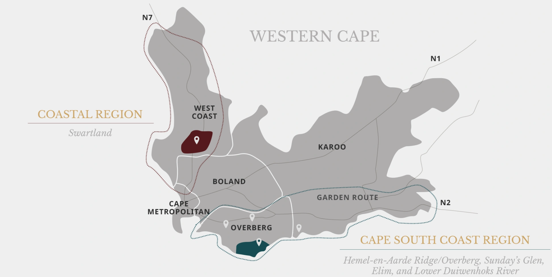 Western Cape is the heart of South Africa’s wine industry, encompassing a broad and diverse set of wine regions, including the world’s famous Stellenbosch, Paarl, Swartland, and Walker Bay. Its maritime climate is shaped by the cold Benguela current and strong oceanic breezes from both the Atlantic and Indian oceans, which help moderate temperatures, reduce disease pressure, and prolonge the ripening season. This results in wines with excellent natural acidity and aromatic complexity. The region’s topography and varied soils, ranging from ancient granite and shale to sandstone and alluvial deposits, allow for a wide range of grape varieties to thrive, from cabernet sauvignon, syrah, and pinotage, to chenin blanc, chardonnay, and sauvignon blanc. The vast diurnal range between warm days and cool nights, further enhance the freshness and structure of the wines. All of this allows Western Cape to produce expressive and terroir-driven wines that balance new world’s fruit generosity with old world’s finesse.