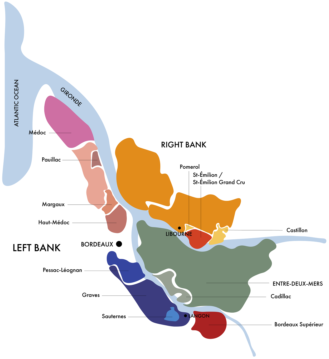 The ‘left bank‘ of Bordeaux is defined by its gravel-rich soils, laid down over centuries by the Garonne River, which provides excellent drainage and retain the much-needed heat, making this region particularly well suited to Cabernet Sauvignon. This terroir is well suited for late-ripening grape varieties, therefore Cabernet Sauvignon dominates the blends, supported by Merlot, Cabernet Franc, and small amounts of Petit Verdot. The Bordeaux‘s ‘left bank‘ is home to some of the world’s most prestigious appellations, including Médoc, Margaux, Saint-Julien, Pauillac, and Saint-Estèphe, each of them expressing the power and finesse of the best Cabernet Sauvignon wines of the world.