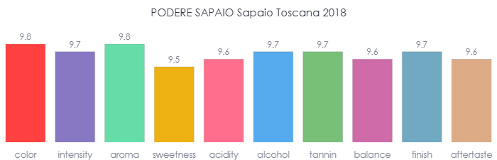 In the glass, the Sapaio presents a deep and opaque ruby color – a visual promise of its concentration and intensity. Towards the rim of the glass, hazy garnet shades emerge, hinting at the wine’s developing maturity and complexity. This is a textbook appearance for a high-caliber Super Tuscan wine.
